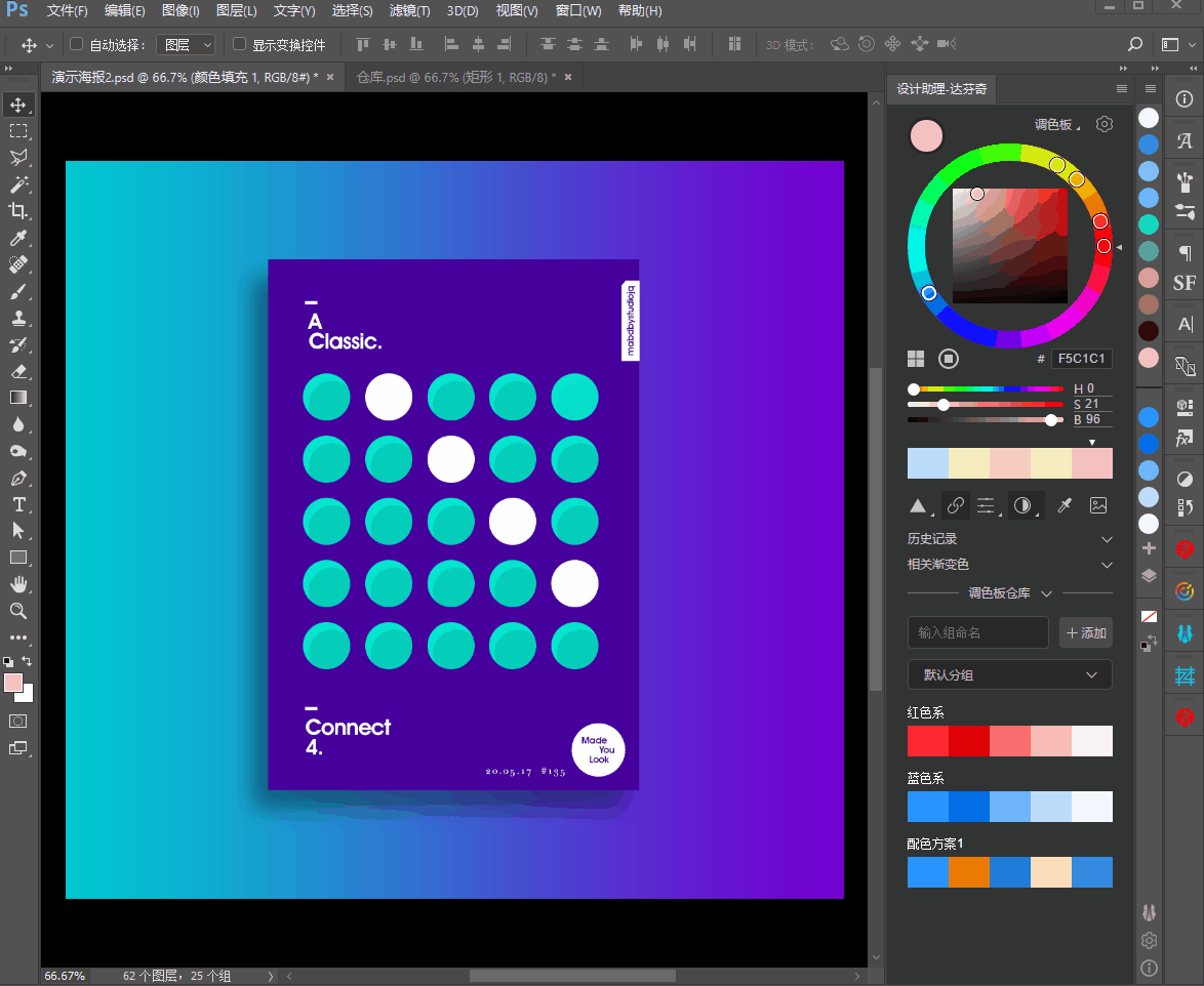 可以理解为一个配色器,跟关联配色功能的区别在于只生成配色,不会改变文档里的图层颜色。 用于寻找配色灵感。还有仓库功能,可以将调配好的配色方案加入仓库中方便下次使用,同时还提供了相关渐变色以及历史记录功能!